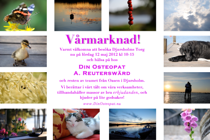 Årets Vårmarknad på Djursholms Torg har gått av stapeln och det var många glada människor som trotsade det opålitliga vädret och besökte marknaden. Jag och några av mina medarbetare på Oasen i Djursholm hade ett partytält där vi stod idag och presenterade våra verksamheter samt så fick folk ta del av en massa bra erbjudanden.