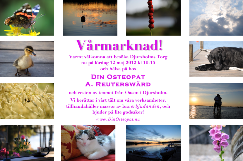 I helgen var det Djursholms Vårmarknad och jag stod då där och representerade och berättade om Osteopati, tillsammans med mina kollegor från Oasen i Djursholm. Vi bjöd på smått och gott, sålde lite produkter, delade ut erbjudanden och rabatter till nyfikna eventuella patienter/kunder, och socialiserade med såväl gamla bekantskaper som nya. Solen strålade och det var nästan högsommarvärme, och alltigenom en otroligt trevlig dag!